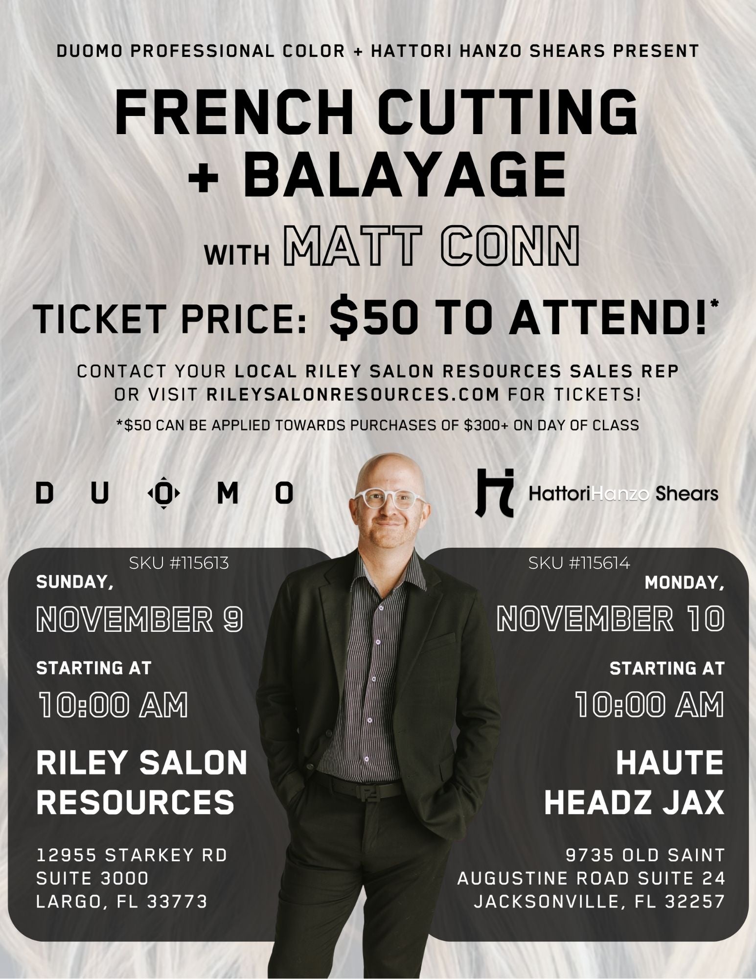 Join Duomo Professional Color and Hattori Hanzo Shears for an exclusive hands-on Look & Learn experience with educator Matt Conn. Discover the artistry of French cutting and balayage techniques that deliver effortless, wearable luxury hair. Learn how to elevate your cutting precision, enhance color placement, and create seamless dimension for every client.