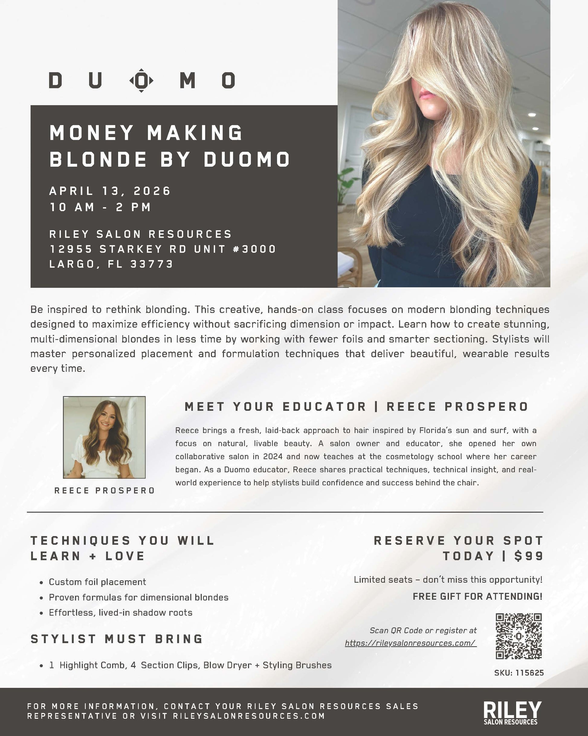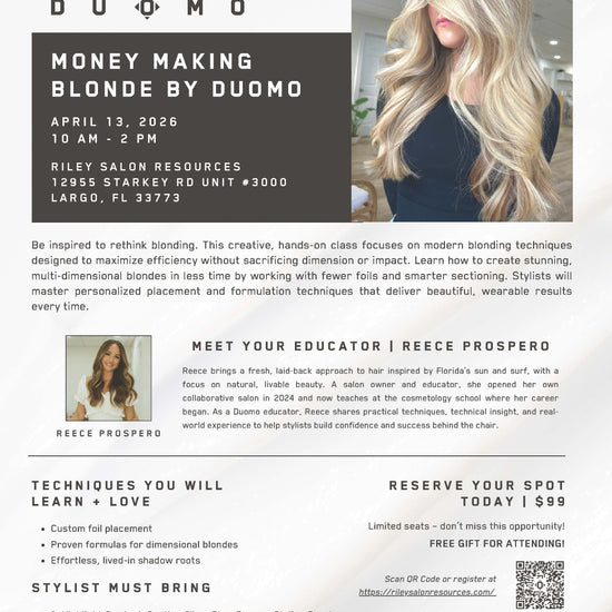 Be inspired to rethink blonding. This creative, hands-on class focuses on modern blonding techniques designed to maximize efficiency without sacrificing dimension or impact. Learn how to create stunning, multi-dimensional blondes in less time by working with fewer foils and smarter sectioning. Stylists will master personalized placement and formulation techniques that deliver beautiful, wearable results every time.