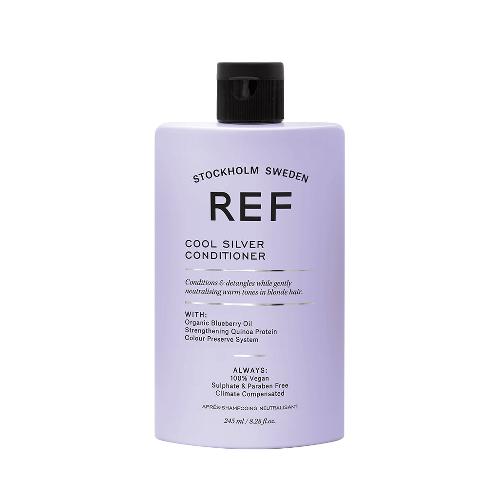 Cool Silver Conditioner with botanical extracts and violet pigments specially chosen to protect, strengthen and neutralise unwanted yellow tones caused from minerals or oxidation. Gently tones lightened, natural or sun bleached hair and protects against colour fading.